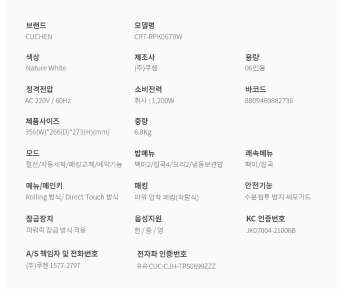 쿠첸 6인용 IH 전기압력밥솥 CRT-RPK0670W 사양