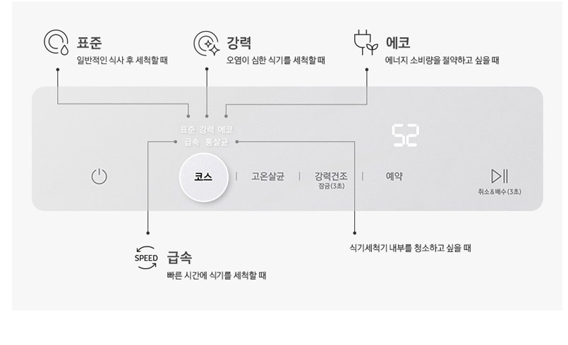 그리고, 다양한 맞춤 코스가 있어 그릇의 오염도에 따라 표준세척, 오염이 심한 식기는 강력세척으로 세척할 수 있고 고온살균 또는 빠르게 세척할수 있는 급속 세척 방식까지 선택할수 있으니 좋더라고요.