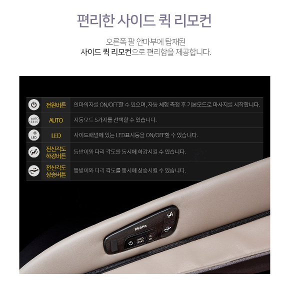 시간조절, 마사지강도. 공기압 강도, 사이드 퀵 리모컨 등의 기능은 기본적모드로 되어 있어 사용자가 편안하고 쉽게 사용이 가능한 제스파 안마의자에요.