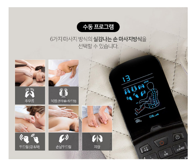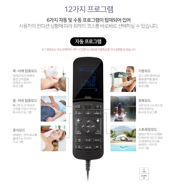 12가지 프로그램으로 나에게 맞는 마사지를 받을수 있는데요. 6가지 자동모드, 수동모드로 최적으로 코스를 바로 선택할수 있어 빠르고 쉽게 안마를 받을수 있어요.